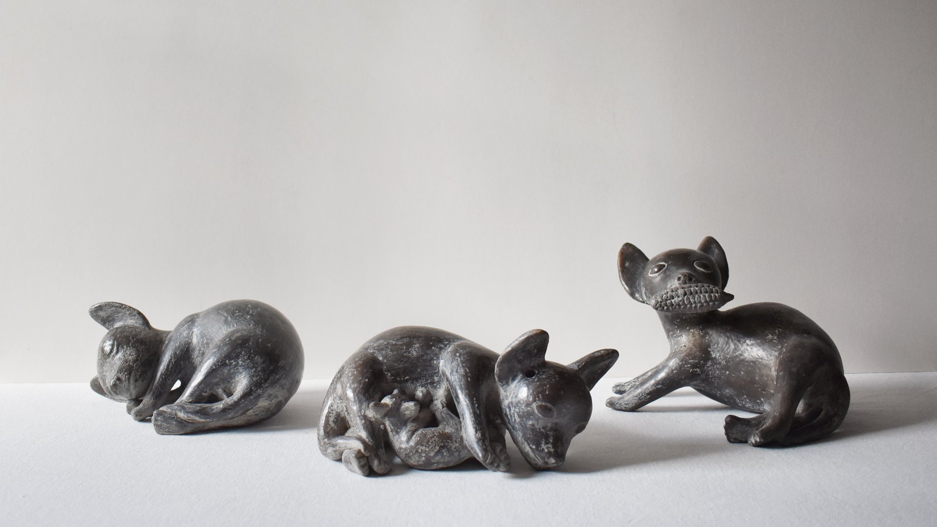 Barro negro ceramic sculpture depicting an xoloitzcuintle dog in a laying position with infant feeding. Hallow form with smooth, yet expressive surface finish.